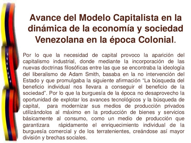 Avance del Modelo Capitalista en la dinámica de la economía y sociedad Venezolana en la época Colonial.Por lo que la necesidad de capital provoco la aparición delcapitalismo industrial, donde mediante la incorporación de lasnuevas doctrinas filosóficas entre las que se encontraba la ideologíadel liberalismo de Adam Smith, basaba en la no intervención delEstado y que promulgaba la siguiente afirmación “La búsqueda delbeneficio individual nos llevara a conseguir el beneficio de lasociedad”. Por lo que la burguesía de la época no desaprovecho laoportunidad de explotar los avances tecnológicos y la búsqueda decapital, para modernizar sus medios de producción privadosutilizándolos al máximo en la producción de bienes y serviciosbásicamente al consumo, como un medio de producción quegarantizara rápidamente el enriquecimiento individual de laburguesía comercial y de los terratenientes, creándose así mayordivisión y brechas sociales.
