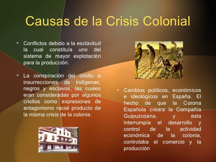 . Causas de la Crisis Colonial• Conflictos debido a la esclavitud la cual constituía uno del sistema de mayor explotación para la producción.• La conspiración del criollo e insurrecciones de indígenas, negros y esclavos, las cuales • Cambios políticos, económicos eran consideradas por algunos e ideológicos en España. El criollos como expresiones de hecho de que la Corona antagonismo racial producto de Española creara la Compañía la misma crisis de la colonia. Guipuzcoana, y esta interrumpía el desarrollo y control de la actividad económica de la colonia, controlaba el comercio y la producción